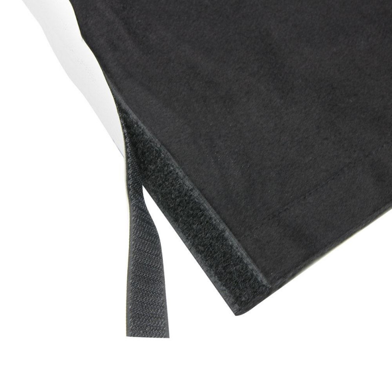 Tela moltón opaca de color negro tratada con retardante de llama (B1 según DIN 4102) y con un gramaje de 300 gramos. La tela está provista de una cinta velcro autoadhesiva, lo que permite fijarla fácilmente en plataformas o estructuras similares y también despegarla en cualquier momento.