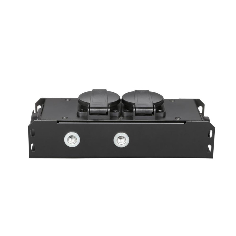 La PROPORT 2T es la base de enchufes ideal para una distribución ordenada y precisa de la corriente en escenarios, travesaños y estructuras de equipamiento. Su robusta carcasa metálica tiene 2 tomas Schuko con tapa plegable, entrada/salida negra/amarilla para la alimentación y transmisión de la corriente, así como dos insertos roscados M10 para montaje fijo o suspendido.