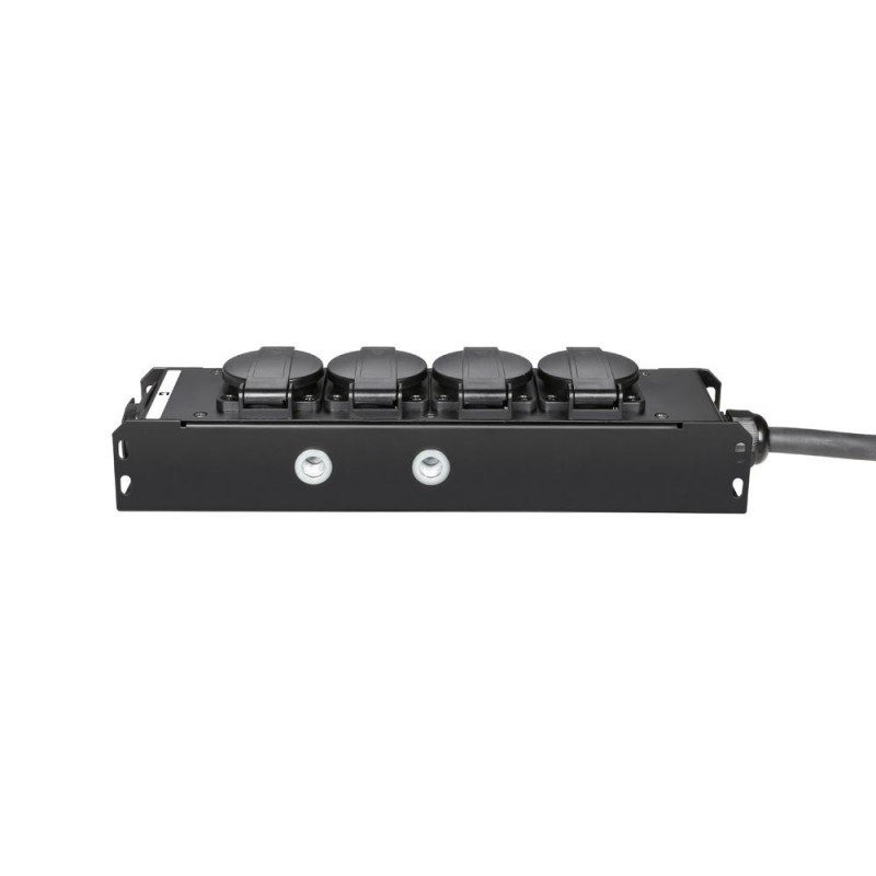 La PROPORT 4CEE es la base de enchufes ideal para una distribución ordenada y precisa de la corriente en escenarios, travesaños y estructuras de equipamiento. Su robusta carcasa metálica tiene 4 tomas Schuko con tapa plegable y una toma de salida negra y amarilla para transmitir la corriente, así como dos insertos roscados M10 para montaje fijo o suspendido. La línea de alimentación, de 40 cm de longitud y con conector CEE de 16 A, está fijada a la carcasa.