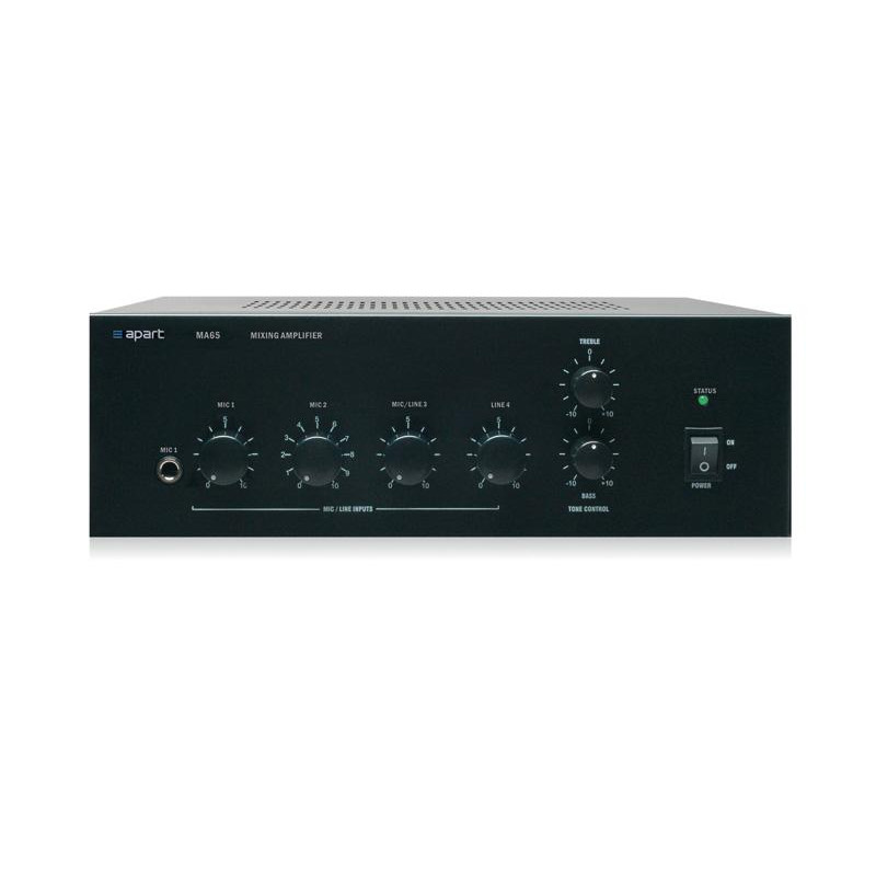 El MA65 es probablemente el mezclador autoamplificado de 65 W 100 V más completo y compacto. Dispone de 4 entradas: 2 de micrófono, 1 de micro/línea y 1 línea. Las entradas de micrófono disponen de alimentación phantom, seleccionable a través de puentes internos. Dispone de un sistema de prioridad de dos pasos: la entrada Mic1 dispone de prioridad activada por voz (VOX) que enmudece al resto de entradas. Este enmudecimiento puede ser desactivado a través de un puente interno. El cierre de contacto (a través de conector DIN5 en Mic1 o conector Euroblock en Mic 1-2) activa un avisador acústico y enmudece las entradas 3 (Mic3/Line3) y 4. Permite la inserción de un procesador de señal externo, o el envío de señal a otros amplificadores de potencia, gracias a la presencia de un punto de inserción situado entre el previo y la etapa de potencia. El MA65 está equipado con control de tono graves-agudos, salida de grabación y circuitería de limitación para prevenir recortes de la señal. Puede funcionar con fuentes de alimentación de 24 y 230 V, y se presenta en una robusta caja metálica. Está disponible el accesorio MA35-19 que permite su montaje en rack estándar de 19'.