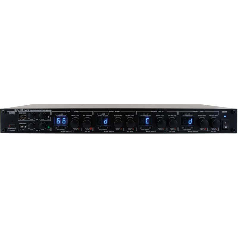 Zone4 es un preamplificador de diseño y fabricación de alta gama, que resulta ideal para aplicaciones multizona. Permite que el usuario controle cuatro zonas estéreo con una sola unidad. Zone4 permite asignar 3 micrófonos y 4 entradas de línea estéreo para cualquiera de las cuatro zonas de salida. Se trata de una unidad profesional, y puede ser controlada digitalmente a través de RS-232, desde un panel de control remoto e IR. Se presenta en formato de rack estándar de 19", con soportes desmontables. La tapa metálica extraíble (incluida) protege los ajustes. Es posible conectar 3 entradas Micro / línea mono a través de un conector Euroblock, facilitando la instalación. Cada entrada de micrófono es asignable a cualquiera de las cuatro zonas, y se dispone de alimentación phantom seleccionable en las entradas MIC2 y 3. Cada una de las señales es asignable a cualquiera de las cuatro zonas de salida, utilizando para ello conmutadores DIP situados en el panel frontal y en el panel posterior de la unidad. También se dispone de una entrada de prioridad para avisos o emergencias. El micrófono para zonas de aviso MICPAT-4 ha sido diseñado especialmente para trabajar con Zone4. Sólo debe pulsar cualquiera de los botones situados en la base del micrófono para poder lanzar un aviso a una de las cuatro zonas. Cada una de las zonas cuenta también con un selector de entradas de línea y un control de nivel. Un display digital facilita la monitorización del funcionamiento de la unidad. También se ha incorporado un control independiente de nivel MIC-MIX y un control agudos - graves por zona. ZONE4R es un versátil y asequible control remoto diseñado especialmente para esta unidad.