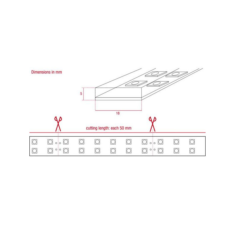 • Longitud de corte: cada 5 cm (12 ledes) = 0,96 W