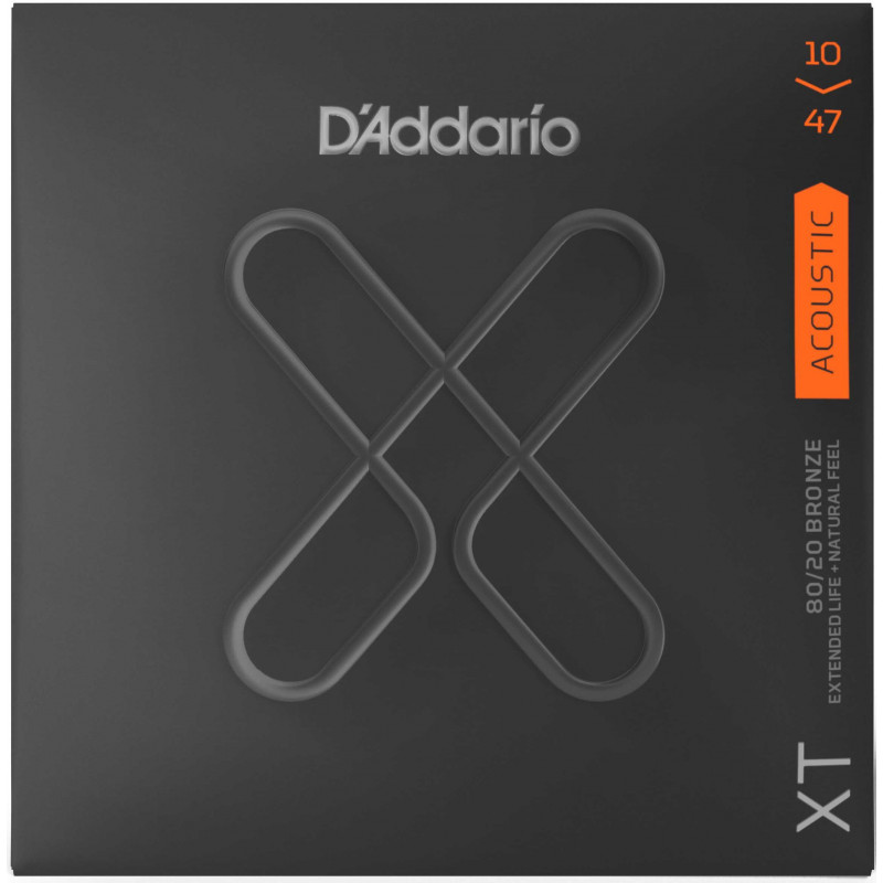 JUEGO CUERDAS PARA GUITARRA ACUSTICA Juego de cuerdas para guitarra acústica XTABR1047 con aleación 80/20 y acabado XT coated anti corrosión. Calibre 10-47. Su recubrimiento de última tecnología asegura una vida 4 veces mayor en el uso de esta cuerda sin sacrificar el tacto y sonido clásicos que caracterizan a la cuerda D'addario. Cuentan con nucleo de acero NY reforzado con carbono para una mayor robustez y flexibilidad que mejora la afinación hasta en un 131%, además, incorporan el sistema de bola soldada reforzada Fusion Twist que minimiza el riesgo de rotura.
