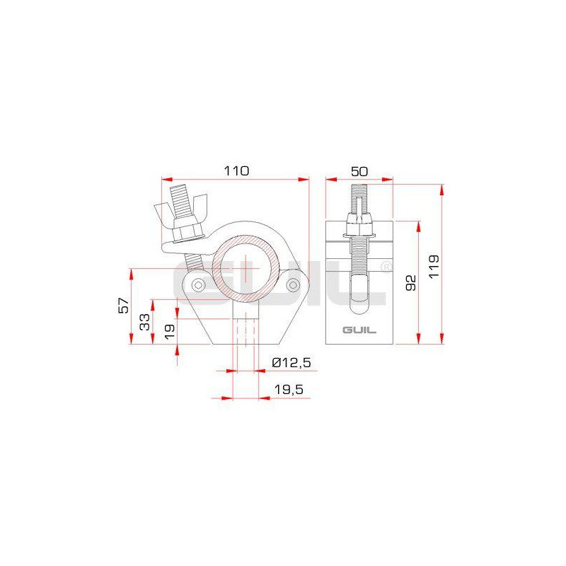 - Substituyendo su tornillo-terminal por : una argolla o una segunda abrazadera (convirtiéndola de esta manera en una abrazadera doble giratoria) se puede utilizar para otro tipo de fijaciones.