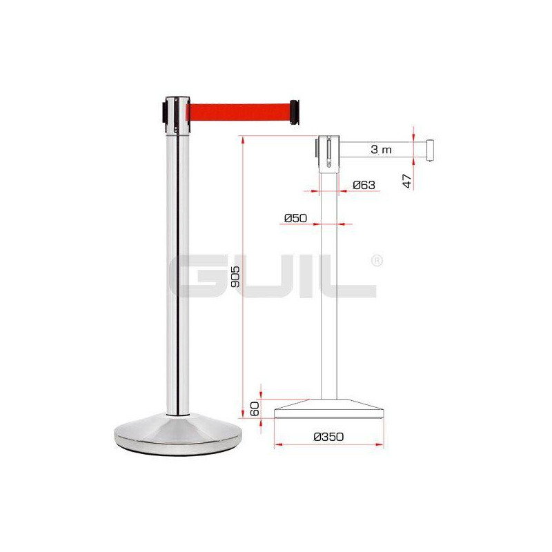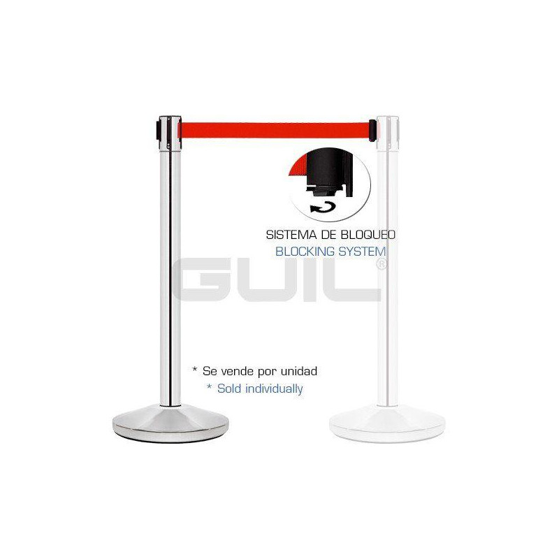 Pilar con cinta retráctil de 3 m con cabezal de 3 vías de enganche y una saliente que permite la fijación de 4 cintas a un solo poste. Tiene un sistema de bloqueo para impedir que se quiten la cinta.
