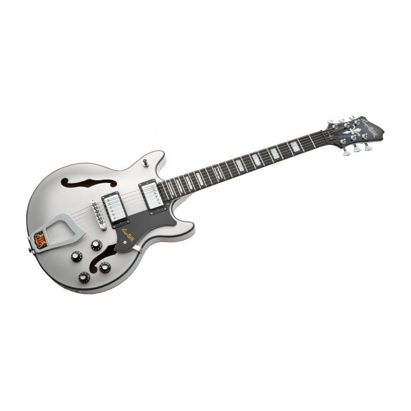GUITARRA DE CUERPO SEMI-HUECO 'Alvar - Swedish Frost, Contoured Ply-Maple Semi-Hollow body, Maple Set-Neck, Long Throw TOM Bridge, Hagstrom Trapeeze, 2 x HJ50 Alnico 5, 2 x Vol RC-Circuit, 2 x Ton , Interruptor de palanca de captació de 3 vies, longitud d'escala de 24,75 polzades, barra de truss expansora en H, afinadors Hagstrom 18:1, diapasó resinador.