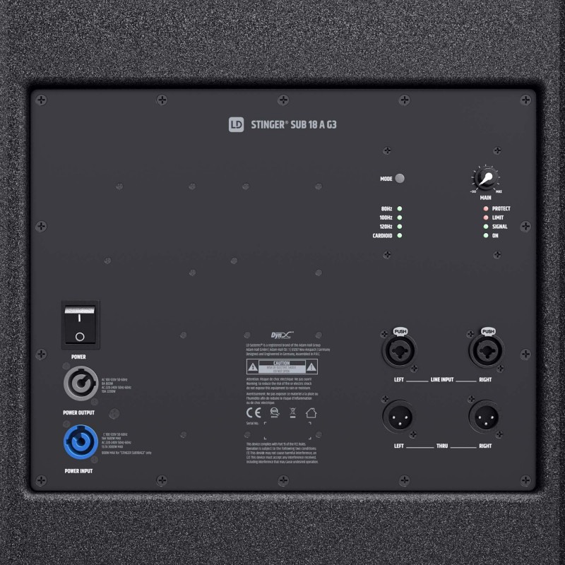 Este subwoofer activo profesional ha sido fabricado para ofrecer una fiabilidad duradera. Sus presets fáciles de usar permiten un ajuste rápido del sistema y la configuración de arrays cardiodes. El STINGER® SUB 18 A G3 emplea un amplificador de clase D muy eficiente con una impresionante potencia nominal de 800 W. El woofer de 18" especialmente diseñado emite unos bajos profundos, potentes y bien definidos.