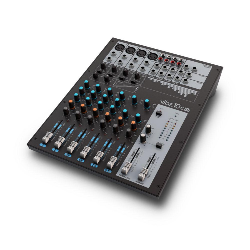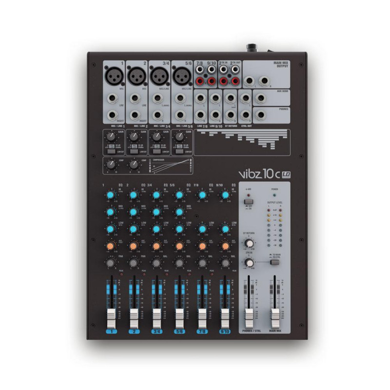 La VIBZ 10 es una mesa de mezclas versátil de 4 entradas de micrófono balanceadas, con previos de alta calidad, filtro paso altos y alimentación fantasma conmutable. Dos canales de micrófono disponen de conexiones insert para realizar un procesado independiente de la señal, y otros dos se pueden usar como canales de línea estéreo.
