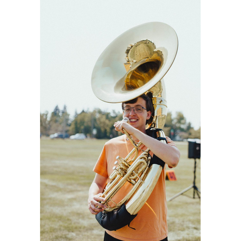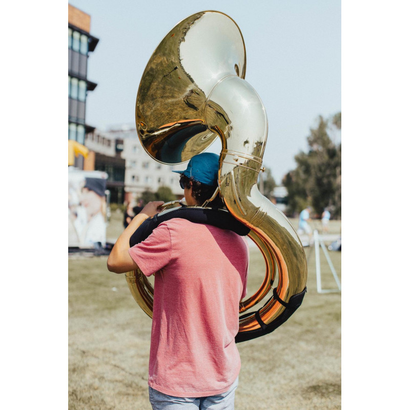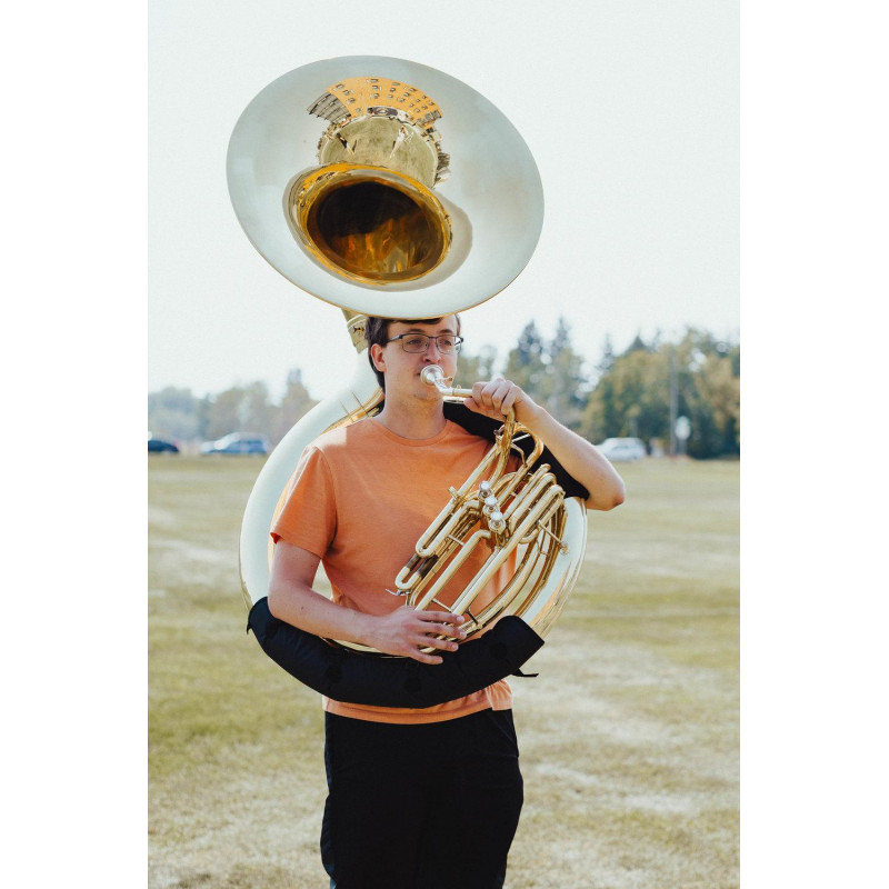 Protecció per al colze inferior de l'helicó . Exterior de niló resistent . Interior amb encoixinat tou . Per subjectar l'instrument mitjançant tancaments de velcro ajustables .