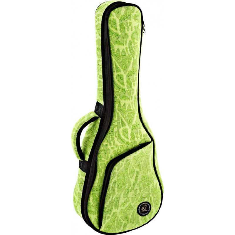FUNDA PARA UKELELE Funda estampada para ukelele tenorcon exterior de algodón estilo ``jean´´ e interior de nylon. 12 mm de acolchado. Con correas estilo mochila. Compartimento frontal. Color Green Jean