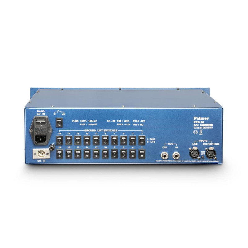 20 salidas XLR balanceadas por transformador con circuitos de excitación emparejados e interruptores individuales de desconexión de masa en la parte trasera