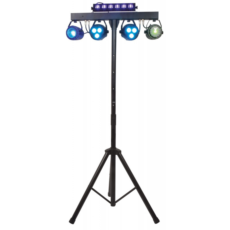 Solució d'il·luminació portàtil completa amb 2 focus PAR, efecte bola, làser i unitat UV/estroboscòpiques, totes alimentades des d'una barra a T principal. Es controla fàcilment mitjançant DMX, control remot per infrarojos o programes interns automàtics i activats per so seleccionables des del panell de control del darrere. Cada accessori de llum té un angle ajustable per distribuir banys i efectes de color per l'habitació. Es subministra amb trípode telescòpic de 2,3 mi bosses de transport, cosa que el fa ideal per transportar-lo a festes i esdeveniments.