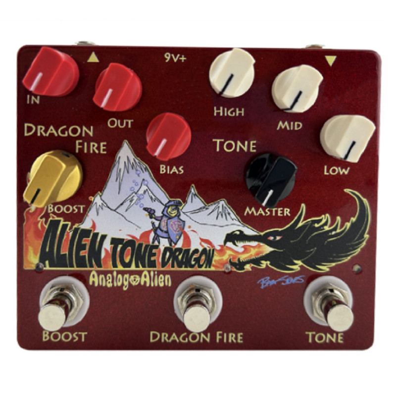 Add some Dragon Fire to your pedalboard with the Analog Alien Tone Dragon (ATD)! Analog Alien guitar pedals have become known for combining multiple effects into a single pedal, and the Alien Tone Dragon proudly continues that legacy. Use Clean Boost to crank up your guitar pedals, restore your pedalboard's gain, or turn your amp up to 12! The Dragon Fire circuit can go from a powerful fuzz to a hot Rock/Blues overdrive, just by adjusting the controls. Finally, shape your sound with a fully active, non-overlapping, 3-band circuit with master volume. You can use the 3 control knobs to easily sweep the tone control until you find the sound you're looking for. Combine all 3 effects for an absolute tonal experience! The ATD will set your guitar on fire!