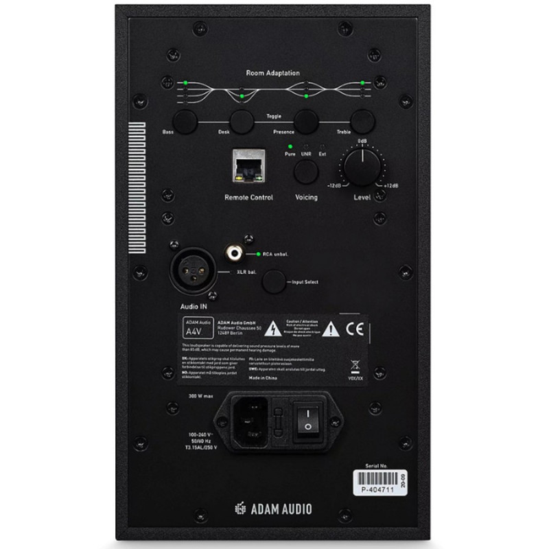 ACTIVE STUDIO MONITOR Designed for small studio spaces, short listening distances, and immersive multi-speaker setups, the A4V delivers precise, full-bodied sound in a compact form factor. This two-way speaker features a 4-inch long-throw woofer made from the same Multi-Layered Mineral Fibers (MLM) as other A-series speakers, plus the classic X-ART tweeter. Built-in DSP-based tuning capabilities let you easily dial in the perfect sound for your space. With a frequency range of 53 Hz to 42 kHz, the A4V can accommodate a wide spectrum of audio applications, from podcast production to string quartet mixing, and is perfectly suited to both 5.1 and 7.1 setups.