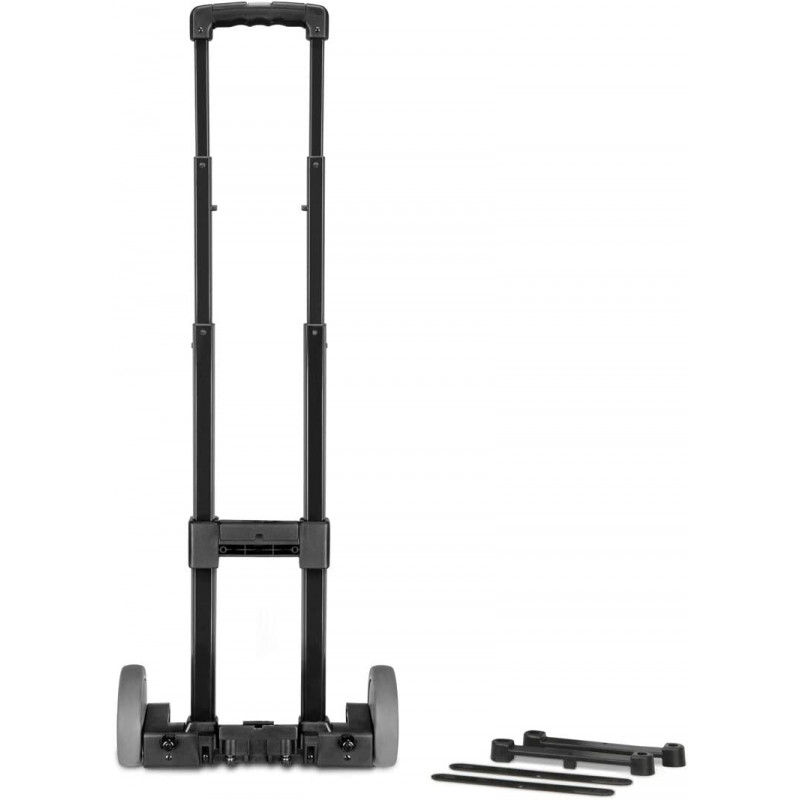 Three-stage extendable handle with locking button on handle. Tubes made of black aluminium, handle and mounting plates of plastic. The trolley is very easy to steer by the handle thanks to the large wheels and wide wheelbase. The handle clips into two included plastic brackets on the case. The mounting plates are compatible with handle 34725, meaning existing older handles can be replaced 1 on 1.