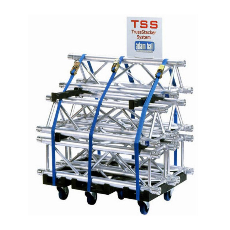 The TrussStacker system allows trussing to be easily and securely loaded onto castor boards and stacked together using notched interfaces for safe transport.
