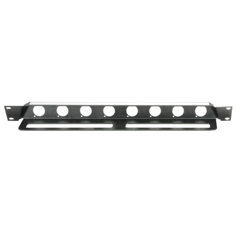 19" angled rack panel with 8 cutouts for D-type sockets - with rear strain relief rail.