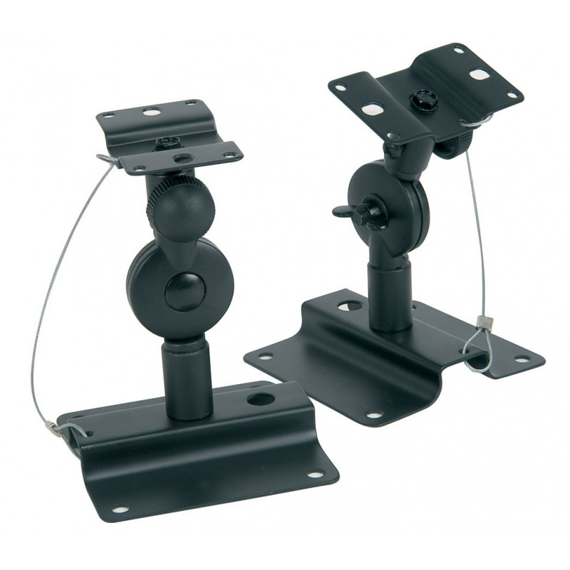 Pair of adjustable speaker stands for wall or ceiling mounting with multi-angle adjustment.