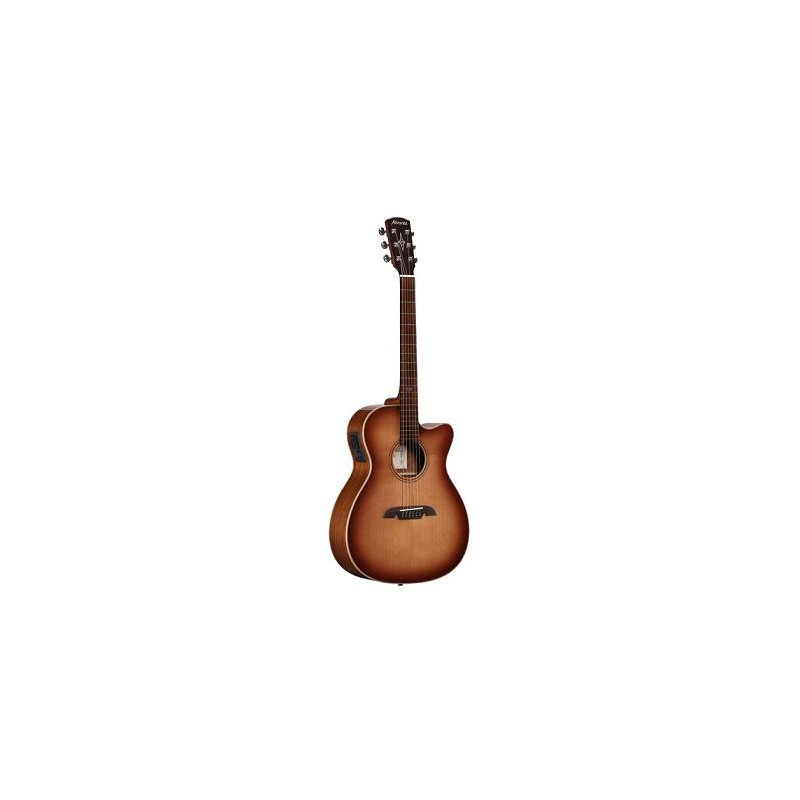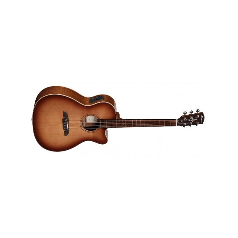 6-STRING ELECTROACOUSTIC GUITAR WITH CUTAWAY Electrified acoustic guitar. Folk/OM Body. Solid AA Western Red Cedar Top. Mahogany neck. Acacia back and sides. FS6 construction. Two-level rosewood and Indian laurel bridge. Rosewood and Indian laurel fingerboard. Nut and saddle of real bone. Premium Die Cast chrome machine heads. 21 frets. Scale 24 13/16”. Flamed maple binding. LR Baggs StagePro EQ amplification system with Element pickup. D'Addario EXP16 strings. Shadowburst finish. Includes AGB-15 holster.
