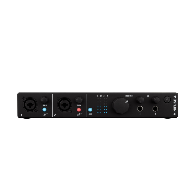 USB audio/MIDI interface with 4 inputs and 4 outputs. Up to 4 input sources can be connected at the same time. 110db dynamic range and -129dB equivalent input noise. Compact and lightweight design. Includes music production tools like Ableton Live Lite, Analog Lab Intro, Guitar Rig6 LE, and 3-month subscriptions to AUTO-TUNE UNLIMITED™ and Splice Creator, as well as Pre 1973, Rev PLATE-140, Delay TAPE-201, and Chorus JUN plugins. -6.2 Mic/Inst/Line combo inputs with phantom power. 2 TRS 1/4" line inputs. 4 TRS 1/4" line outputs with volume control on outputs 1 and 2. 5-pin DIN MIDI I/O. 2-port USB2.0 hub. USB-C compatible with PC & MAC and with USB2.0. 2 TRS 1/4" headphone outputs. 5-year manufacturer's warranty. Black finish.