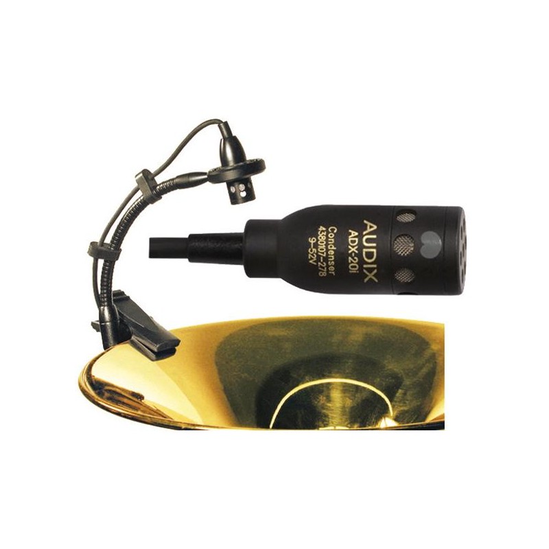 SMALL MEMBRANE CONDENSER MICROPHONE Miniature condenser microphone with gooseneck and adapter designed for metal wind instruments. Polar pattern: cardioid. Frequency response: 40Hz - 20KHz. Impedance: 250Ohm Off-axis attenuation:> 20dB. SPL Max: 135 dB. Sensitivity: 5.8 mV / Pascal. APS-910 phantom adapter included. Gooseneck clip, foam and carry bag. Download complete specifications sheet in pdf in this link ... http://www.audixusa.com/docs_12/specs_pdf/ADX20i:ADX20iP_v4_0517.pdf