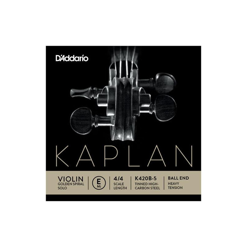 LOOSE STRING FOR VIOLIN Kaplan K420B 5, Mi (E), ball, strong tension. Made with a gut core, the Kaplan Golden Spiral Solo strings A, D, and G produce a warm sound and are specially calibrated to serve the needs of the most demanding performers. The K420 series E strings are constructed of a carbon alloy / steel, available in a ball finish.