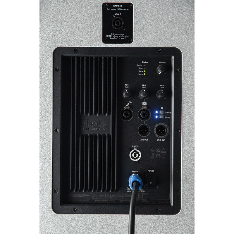 The Frigga features a dual 12" active subwoofer with a built-in amplifier for the column speaker. The column speaker includes six 4" neodymium midrange drivers as well as one 1.5" neodymium compression driver. The integrated amplifier provides 1000 W RMS (2000 W peak power) on three channels. Two mounting posts adjust the height for various configurations.