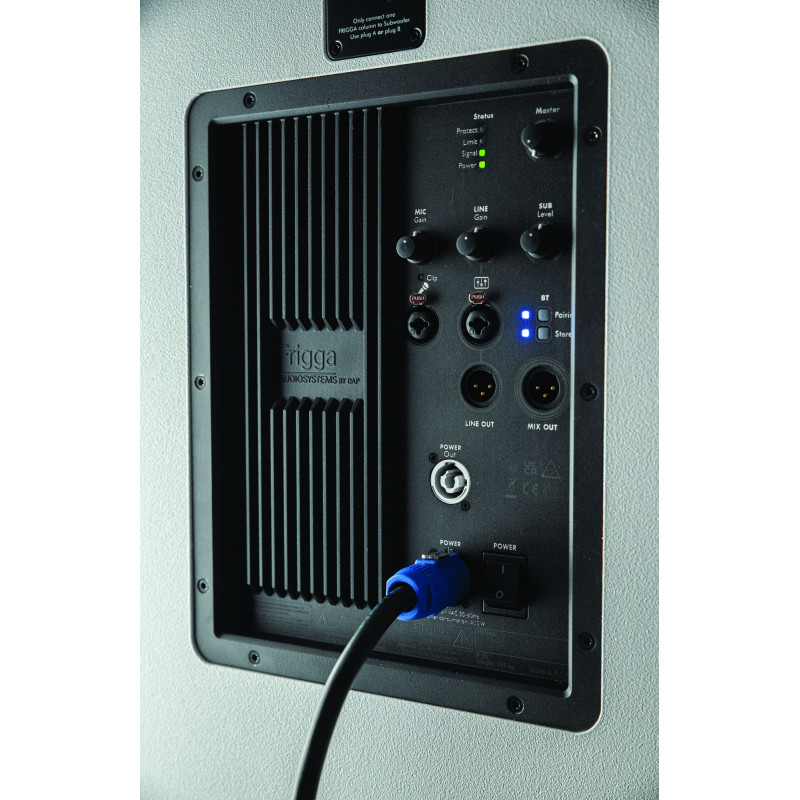 The DAP Frigga is an active public address system with a subwoofer and a column speaker, suitable for singer-songwriters, corporate presenters, traveling DJs, nightclubs and music groups. It offers three inputs: XLR microphone input with gain and clip indicator, XLR line input with passthrough and TWS compatible Bluetooth. Mixed output combines all signals. The SUB level control and Master level control adjust the balance and volume. Status LEDs indicate the status of the amplifier.