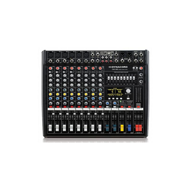 MIXING TABLE 8-channel mixer (4 mono + 4 stereo). 6 MIC / Line inputs (XLR and TRS ¼), 2 stereo line inputs (TRS ¼ and RCA), and 4 channels of 24-bit / 96 kHz digital audio input. 3 busses: MONitor (Pre Fader), eFXecto (Post Fader) and AUXiliar. MUTE and PFL. Phantom (48 V DC). Balanced stereo MASTER A output (XLR and TRS ¼). 9-Band graphic equalizer. Balanced MASTER B output (TRS ¼). Balanced MONitor mono output (TRS ¼). Balanced mono AUX output (TRS ¼). Unbalanced stereo recording outputs (RCA). 24-bit / 96kHz Digital Audio Interface. 24-bit stereo effects processor. 100 presets, being able to be modified and later saved in 20 user memories. High contrast OLED (128 x 64) display. AC power: 100 - 240VAC, 50 - 60Hz. Dimensions (H x W x D): 347.8 x 416.9 x 108.6mm. Rack Mount Dimensions (Hx W x D): 332.6 (7.5U) x 483 (19) x 99.1mm. Weight: 5.8 kg.