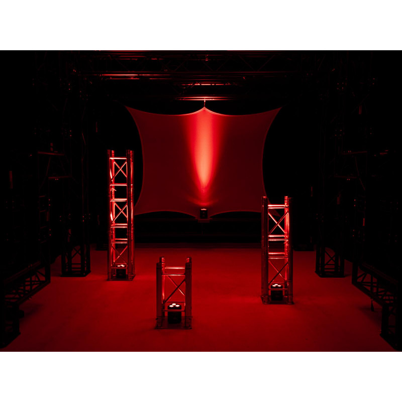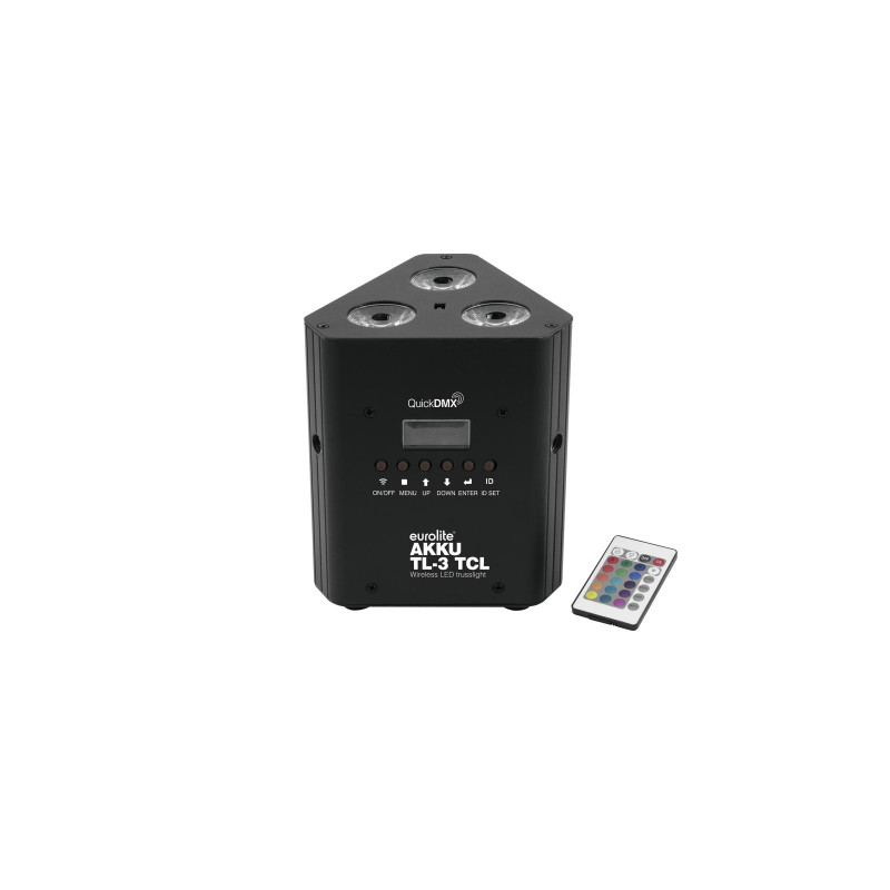 The AKKU TL-3 TCL Trusslight QuickDMX is a spotlight equipped with 3 bright 3-watt RGB LEDs (3in1) for lighting within trussing. It is wireless and battery-run (battery life 16 hours) and its small size makes it a great fit for many 3- and 4-point trussing systems. Furthermore, this device is equipped with a built-in QuickDMX transceiver for wireless transmission of DMX512 signals.You can choose from a variety of different functions such as static colors, continuous RGB color mixture, internal programs, dimmer effects as well as strobe effects with adjustable speed. The device can either be controlled via DMX or the supplied wireless remote control (Eurolite IR-13). All of these features make the AKKU TL-3 TCL the perfect choice for booth construction, stages and any kind of truss.