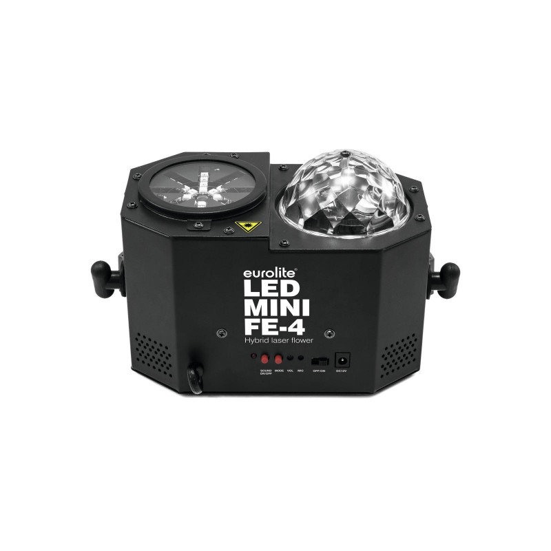 With this party light by Eurolite you can illuminate small and medium-sized rooms in three different colors plus white - and cover the room in fancy wash and strobe effects.A rotating mirror ball with four LEDs swirls brilliant RGBW colors through the room while an extra 32 LEDs make for strobe effects, chases and more. Tiny light dots from two laser diodes make a great contrast to this sea of colors. For control you can either rely on the four preset programs or you use the supplied IR remote control to make adjustments.The Eurolite Hybrid Laserflower is equipped with a microphone adjusting the effects to the rhythm of the music if you choose the sound-controlled mode - without any further adjustments on your part. All necessary plugs and cords are included and the mounting bracket allows for installation at any location you choose. The Mini FE-4 is an all-rounder for every occasion, be it slow wedding dances or a lavish party.