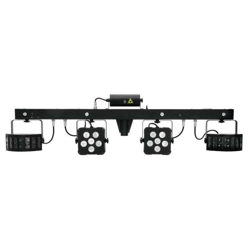 - 4-in-1 DMX light effect bar with laser, 2 rotating LED derbies, 2 LED spots and strobe LEDs in white and UV