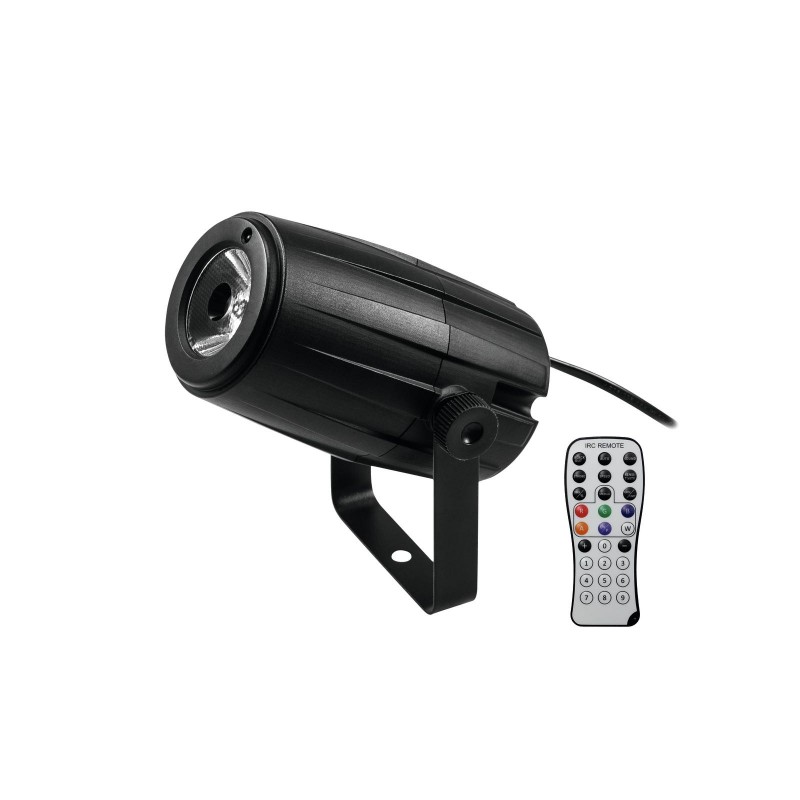 The LED PST-5 QCL Spot by Eurolite offers sharp and atmospheric RGBW beams and is suitable for illuminating mirror balls and decorating window displays, trade fairs and more!One 5-watt 4in1 LED with RGBW color mixture produces thrilling color mixtures, dimmed light as well as dynamic strobe effects - easily controllable in automatic or sound control mode via the integrated microphone. Thanks to the memory function, it is also not necessary to reconfigure the fixture for each use: It automatically plays the most recently used program.The fixture is to be operated via the supplied IR-7 remote control. The adjustable bracket makes for a quick and easy mounting to a wall or ceiling.