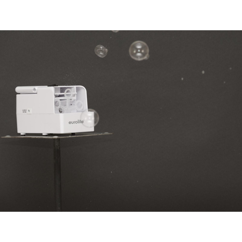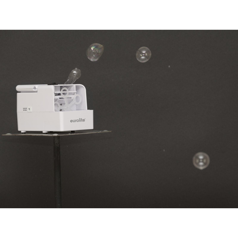 Mini bubble machine with battery operationThe portable mini bubble machine EUROLITE B-20 is especially suitable for spontaneous use at weddings, birthday parties or as a party gag.There are two speed levels to choose from - operation is very easy.The built-in safety function is particularly notable: the wheel stops automatically when there are obstacles and does not start again until two seconds after removal.The EUROLITE B-20 mini bubble machine works with 4 x 1.5 V batteries or a USB power bank. A USB power supply is included.