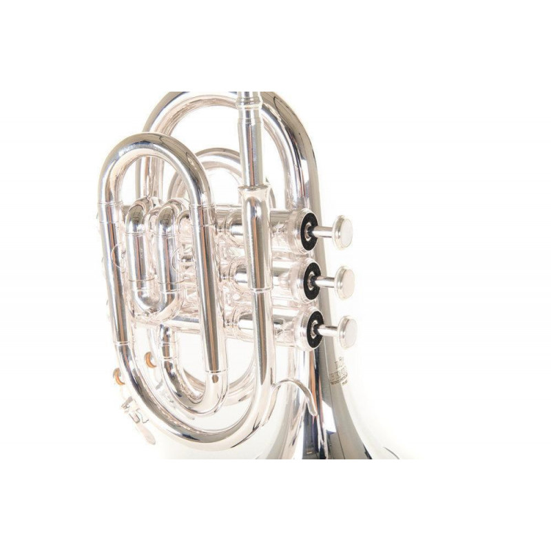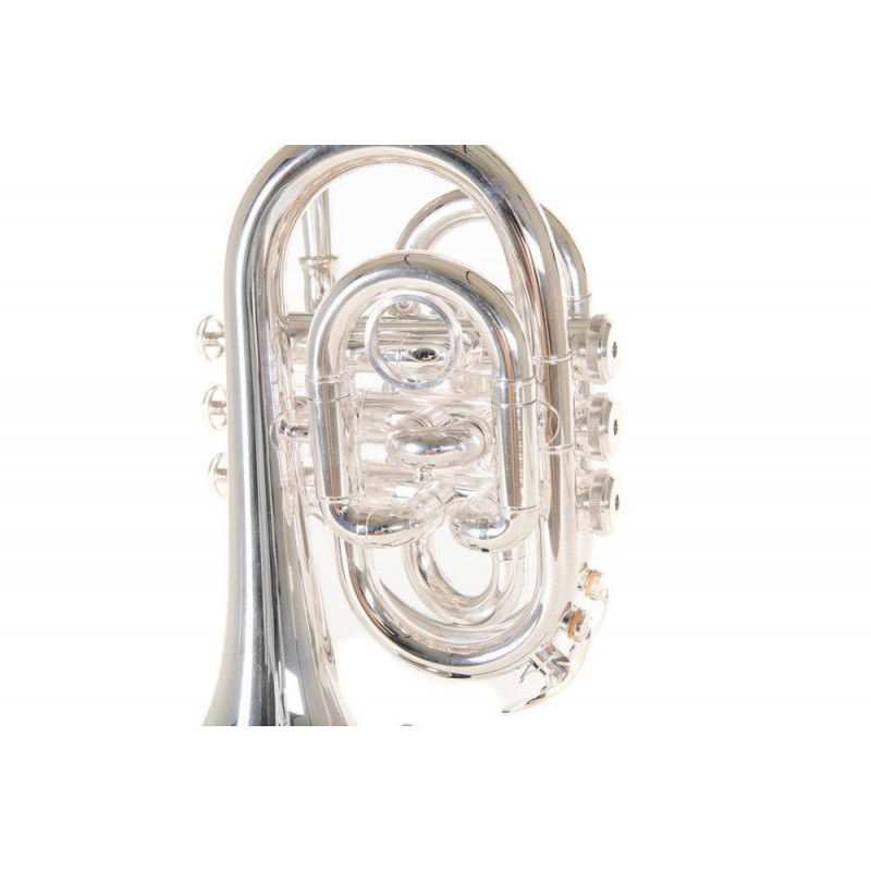 Yellow brass bell. Gold brass leadpipe. Stainless steel pistons. Top spring action. Two point nylon valve guides. Thumb ring on 3rd valve slide. 2 water keys. Silver plated finish. Light rectangular case with rucksack assembly.