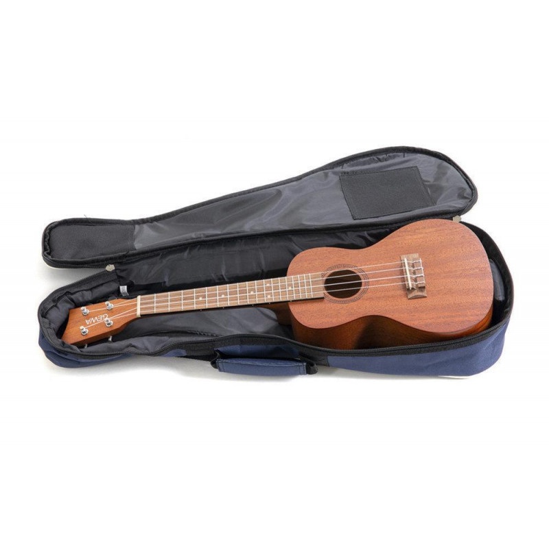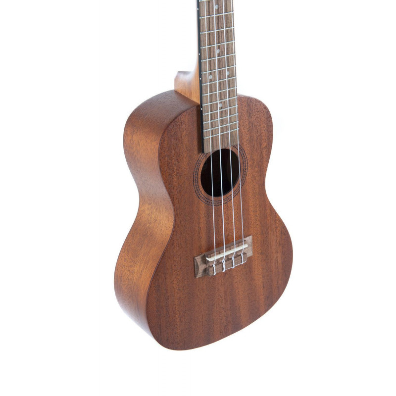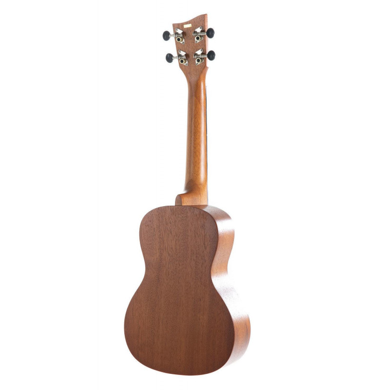 Body and neck Sapelli. Laser Herringbone rosette. Fingerboard and bridge American Walnut. Nut and bridge inlay Nubone. Scale 376 mm. nut width 35 mm. Chrome-plated. open machine heads with black buttons. Aquila Supernylgut strings. Open pore silk matt finish. Incl. padded gig bag.