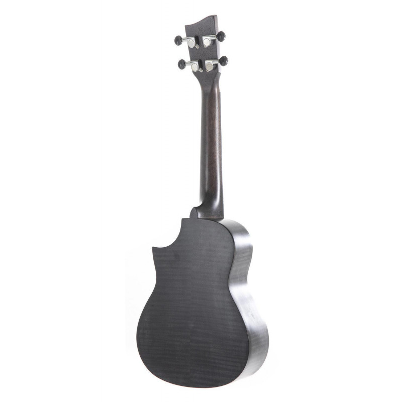 Concert Ukulele with cutaway. Body flamed Maple . Okoume neck. Abalone rosette. Fingerboard and bridge American Walnut. Nut and bridge inlay bone . Scale 382 mm. nut width 35 mm. Chrome-plated machine heads. Aquila strings. Satin finish: Black Faded. Incl. padded gig bag.