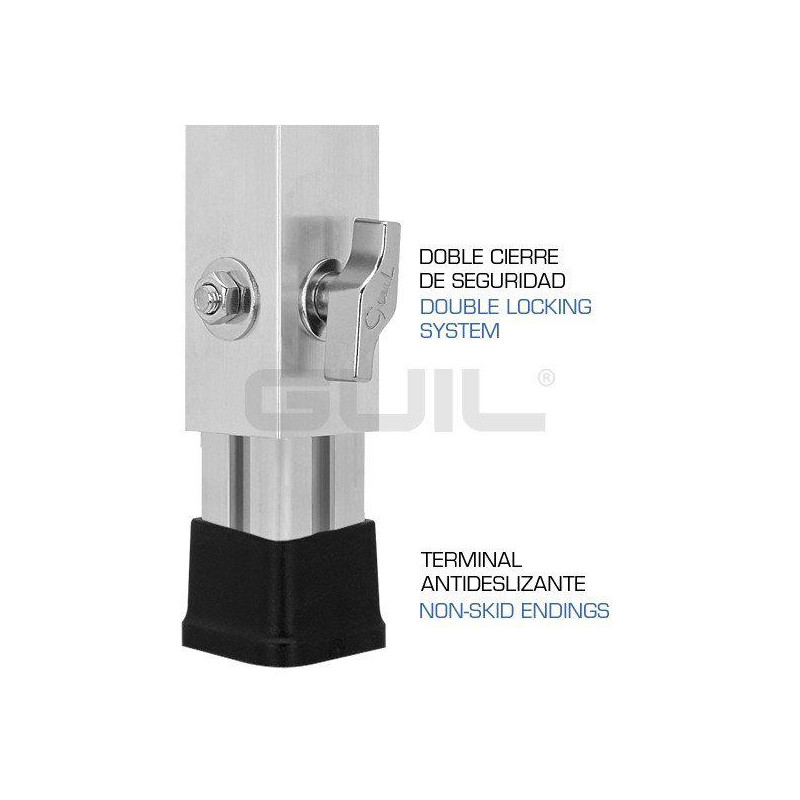 Legs with 60 x 60 mm outer profile, made of high-strength aluminum (Alloy: EN-AW 6082 T6 according to UNE-EN573) Provided with a terminal injected in non-slip rubber that prevents any movement; guaranteeing a perfect fit to all types of surfaces.