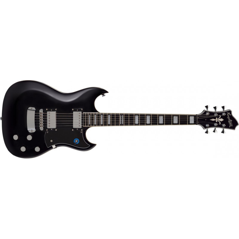 DOUBLE CUT ELECTRIC GUITAR 'Pat Smear Signature Black, Mahogany / Carved Maple Top, Mahogany - Set Neck, Long Throw TOM, Hagstrom Sustain Blocks, 2 x Custom 58, 2 x Vol RC-Circuit, 2 x Tone, 24.75'' scale length , H-Expander Truss Rod, 18:1 Hagstrom Tuners, Resinator Fretboard'
