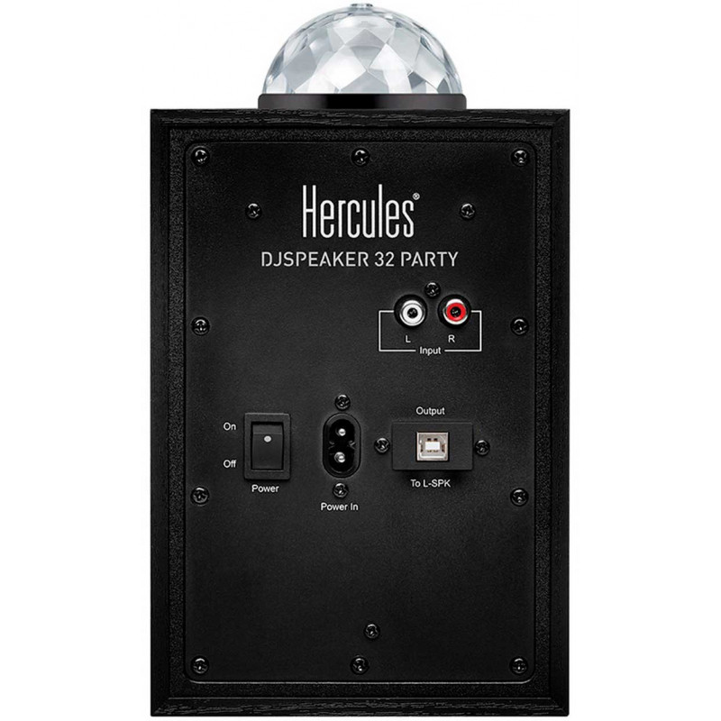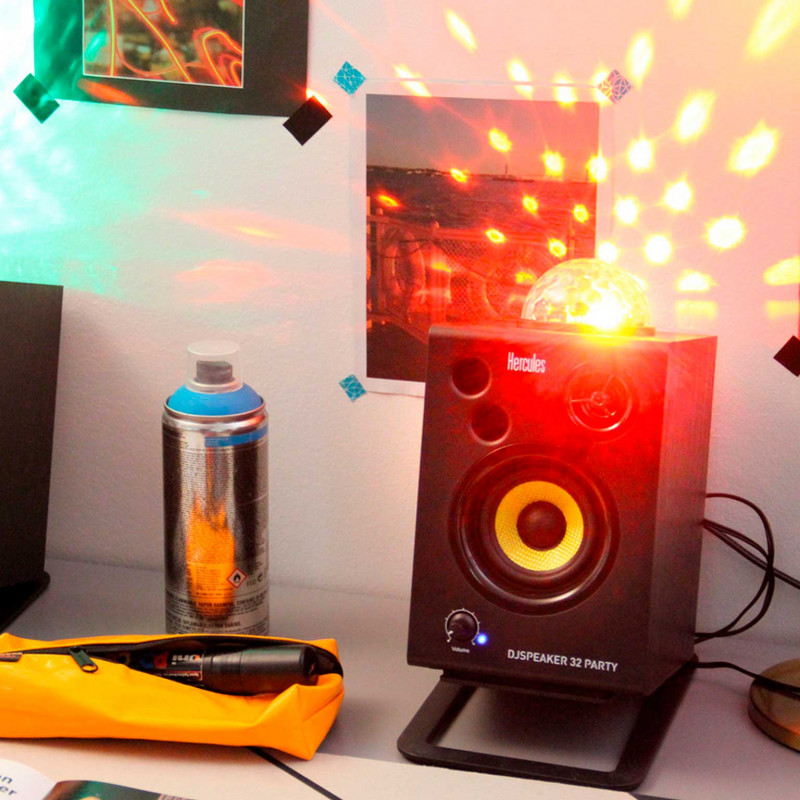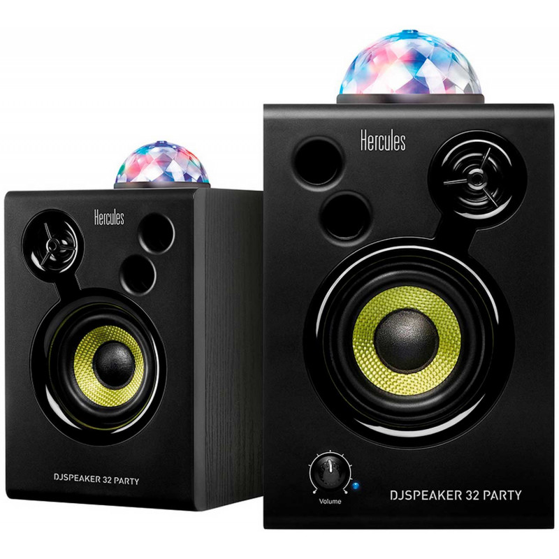 PAIR OF ACTIVE STUDIO MONITORS 'The Hercules DJSpeaker 32 Party speakers liven up your parties with quality sound and an LED lighting system that creates a colourful atmosphere. Each speaker features a luminous dome with flame and projector effects that make your event unique. Easily controlled via the included IR remote control, the speakers let you choose from 4 different lighting modes – keeping the mood alive at your next birthday party, New Year's Eve bash or spontaneous get-together! Controls & Connectors ON/OFF switch Master volume control Power LED RCA audio input Remote control of light effects Technical specifications RMS output power: 2 x 20 watts Maximum power: 60 watts Frequency response: 60 Hz – 20,000 Hz Dimensions: 235mm x 135mm x 155mm (W x L x D) Right satellite: 1,491kg Left satellite: 1,342kg Internal power supply Dual light control system with remote control, flame and spotlight effects Mode 1: Lighting effect to the rhythm of the music. Mode 2: Lighting effect to the rhythm of the music, active even during transitions between two songs. Mode 3: Fast flashing effect to the rhythm of the music. Strobe function: The flashing effect continues to work even when there is no music, so the amazing lighting does not stop. Mechanism Phase-inverted tweeter for clearer sound reproduction and more noticeable stereo effect in space Double bass opening Acoustic guide optimized for high-performance sound reproduction Box made of 6mm MDF Satellites connected via terminal block'