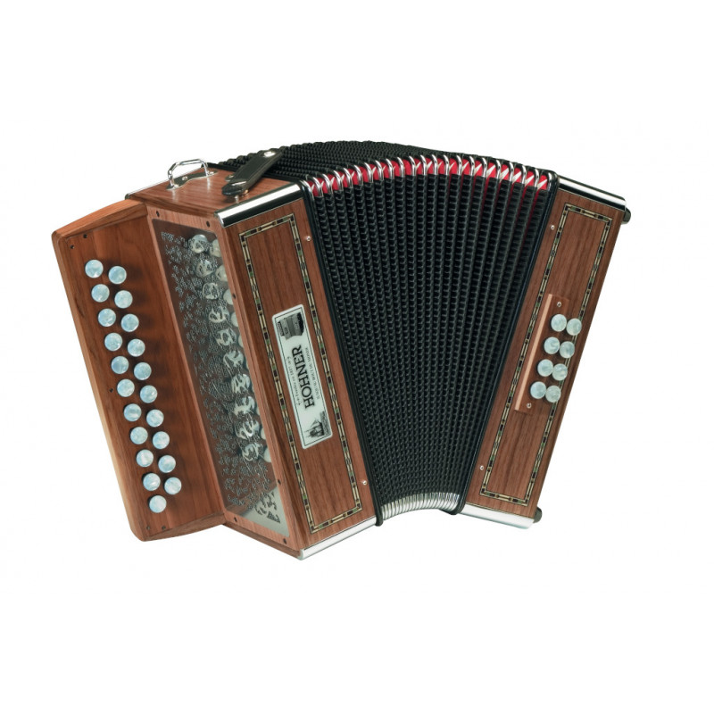 DIATONIC BUTTON ACCORDION Folk Line. With our beautiful Morgane, named after the enchanting saga of King Arthur, you have the ideal companion if you wish to explore the world of Welsh, Breton and French folklore. With its distinctive sound and beautiful design, the Morgane is the right choice for advanced and professional musicians. Diatonic accordion, 42 notes, 21 buttons, 2 voices, G/C tuning, 8 basses, 5 voices on the bass. Dimensions 28.5 x 15.5 cm., weight 3.3 kg, natural wood color. Includes standard straps and leather case.