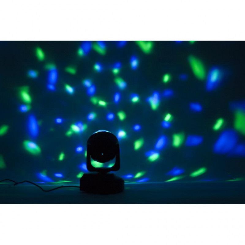Compact moving head that projects multicolored light effects throughout the room. You can tilt your head to direct the light beams where you need them.