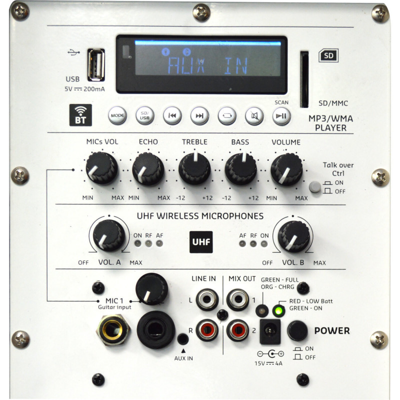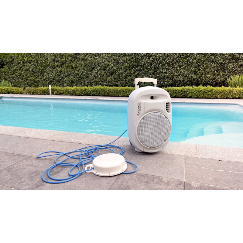 This system benefits from all the functions, features and accessories of our star product PORT12UHF-WH-MKII. Please take into account its main characteristics: USB connection, Bluetooth, Line, MP3 and Microphone, 2 UHF Microphones (handheld and head-mounted) , High capacity battery, protective case, remote control, built-in trolley. In addition to having the tropicalized speaker, the system has been technically modified to allow the addition of an underwater speaker with a power of 30W, which is connected by cable to the supplementary amplifier that has the speaker inside and said underwater speaker can be put into operation. a swimming pool, to be able to listen to music in the water. The volume of the underwater speaker is individually adjustable and allows you to make it sound only if desired, the equipment alone or both at the same time. In this way, this system is not only aimed at individuals who want entertainment on outdoor evenings, but also for groups and sports clubs for water sports, such as synchronized swimming. It is very surprising to be able to understand the animation outside and also under water.