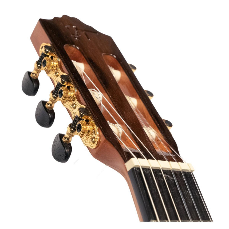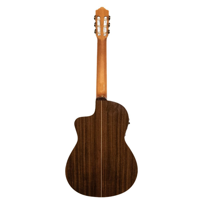 CLASSICAL GUITAR WITH PREAMP Electric classical guitar with cutaway. Solid cedar top. Indian rosewood back and sides. Cedar neck. Ebony fretboard. Polyacetal nut (POM) 52mm. Golden headstock. Sapele trim. 650mm scale. Fishman Prefix Plus T Preamp. Glossy finish.