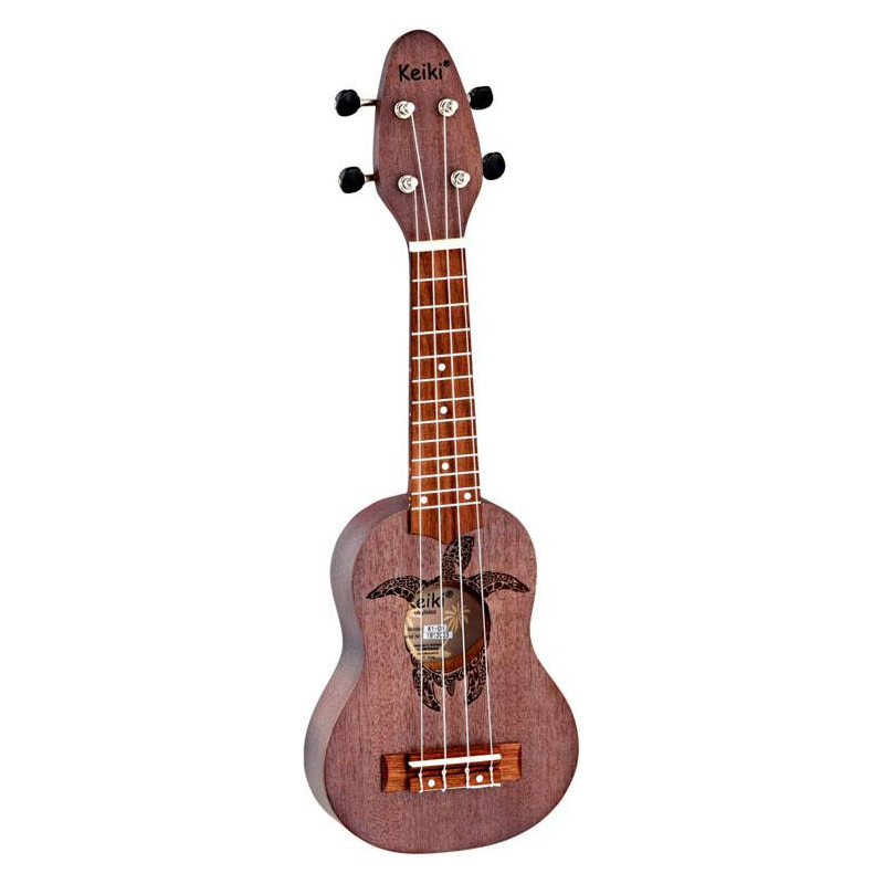 UKELELE SOPRANINO Ukulele Sopranino Keiki K1-MM. (smaller than the soprano, scale 248mm). Satin finish in carbon color. Body and neck of okoume, fingerboard and walnut bridge. Laser engraved okoume lid with "turtle" design. Chrome and black headstocks. Mount Ortega UWNY-4-SO strings for standard Soprano.