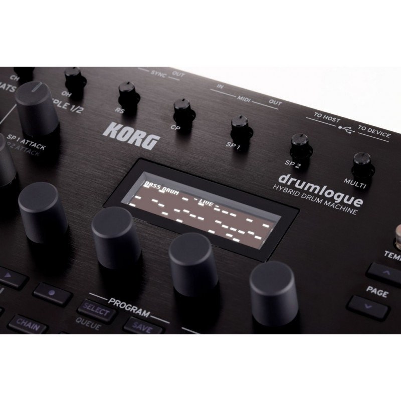 RHYTHM BOX Drumlogue is a new hybrid drum machine with 4 analog parts (voices) and 7 digital parts (voices) that deliver extraordinarily rich, powerful and exciting sounds with unprecedented rhythmic possibilities. The sound engine is extremely flexible and the open architecture allows users to easily change digital samples, or use custom oscillators and effects using the new logueSDK platform. The USB port allows the use of compatible MIDI controllers such as nanoPad2 or microKEY (including MIDI velocity information) allowing you to play the drumlogue in real time. The user interface is simple and intuitive to make creating new sounds easy and fun. In addition to its main L/R output, 4 other parallel outputs provide even more freedom,