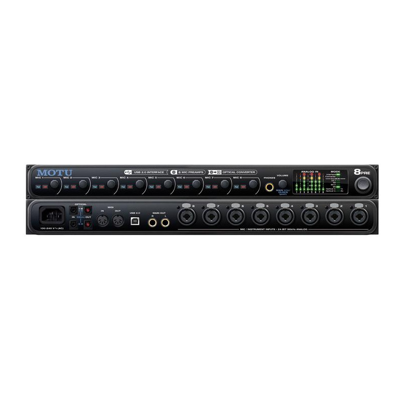 USB FIREWIRE & HYBRID AUDIO INTERFACE. MOTU AUDIO INTERFACE USB 2.0 8 PRE. The 8 pre USB 2.0 audio interface offers everything you need to turn a computer into a powerful 24-bit, 96kHz DAW (digital audio workstation) with a quality/price ratio without many competitors on the market. Eight mic preamps with 48V phantom power and crystal clear analog signal recording and digital conversion at frequencies up to 96kHz. The mic preamps are further combined with 8 optical ADAT channels of digital I/O. Easily expand your system by connecting additional 8 pre units to other MOTU interfaces such as the 828MkIII or 896HD to increase the number of inputs and outputs available on any system. You can use the Cue Mix software to mix the 16 inputs from your computer and get up to 4 different mixes of the input signals to, for example, send them to musicians in the recording booth or to stage monitors. The 8 ADAT channels make your 8pre the ideal companion for your digital mixing console (which has ADAT inputs), or you can use it to increase the total number of inputs to your DAW system. If you have a 2408 MkIII you can use the 8pre connected to the ADAT inputs on it to get an additional 8 mic input channels and all at 96Khz. In addition to all these possibilities, we also have a MIDI in-out port with the precision timing characteristics that have made MOTU's midi interfaces famous. Excellent low latency drivers for both ASIO and CoreAudio. (Check the manufacturer's website for updated information on compatibility).
