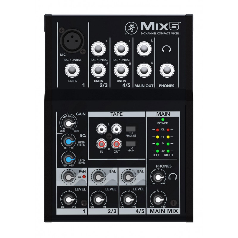 MIXING TABLE Mackie Mix5 mixer. Compact 5-channel mixer with high threshold and low noise performance. 1 microphone / line input with studio-level audio quality. 2-band EQ with clean and precise tone formation. Phantom power for condenser microphones. 2 stereo 1/4 line inputs? Dedicated stereo RCA inputs / outputs for playback or recording. Main L / R outputs (1/4? Balanced / unbalanced). Headphone output with independent volume control. Robust, reliable design built to last. Extremely compact and portable.
