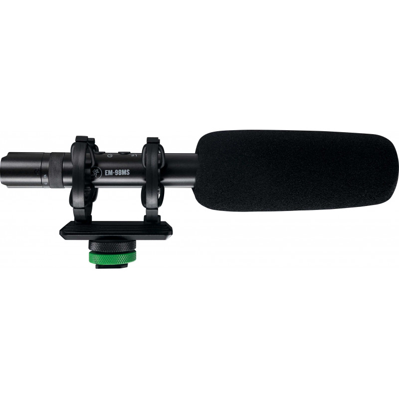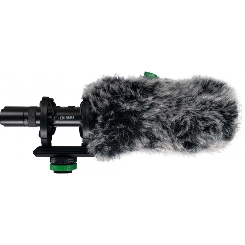 CAMERA MICROPHONE The best video is nothing without great audio to accompany it, and that starts at the source. Capture transparent, broadcast-worthy sound with the EM-98MS high-directivity mobile shotgun microphone on your DSLR or smartphone. Designed to minimize off-camera sound, this lightweight microphone is perfect for indoor or outdoor content creation. With features like variable gain level and high-pass filters, tailoring the sound to your needs is easy and flexible. You can even connect a pair of headphones directly to the microphone to monitor its output. And with an internal lithium-ion battery, you'll be ready for action without the need for external power. The EM-98MS includes everything you need to get started, such as two different windshields, a professional shock mount, cables and a carrying case. Upgrade the EM-98MS microphone and capture your audio like a pro.