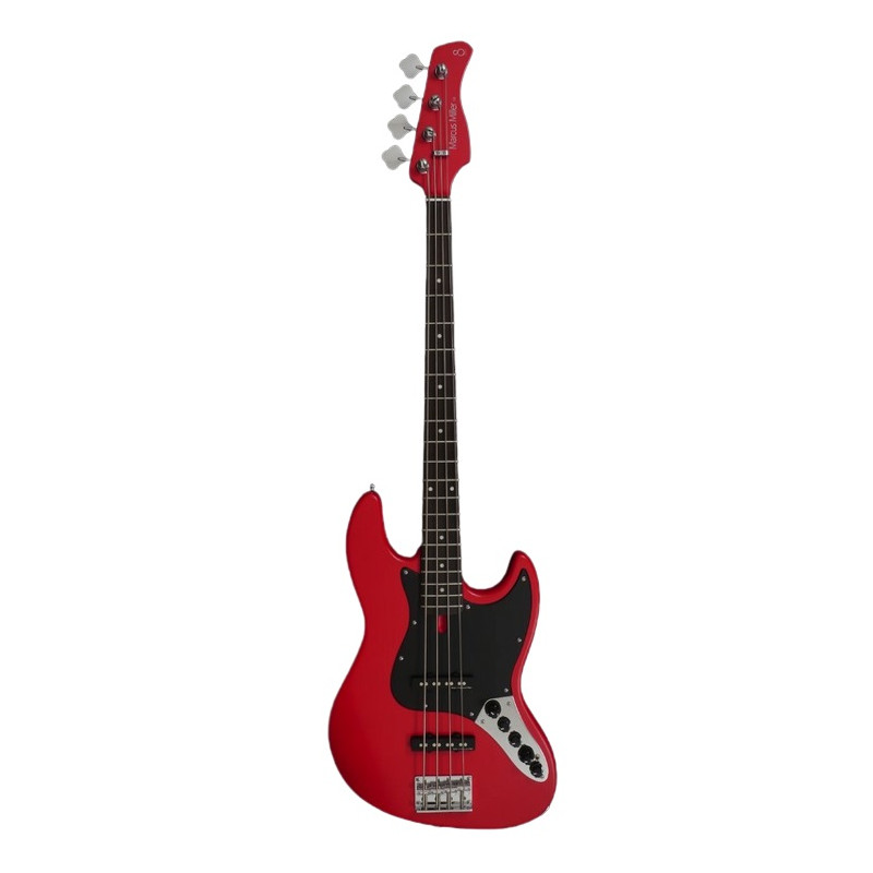 Under Marcus Miller. Body: Mahogany. Shape: New Marcus Miller Jazz Type. Neck: Canadian maple. Shape: C-Shape. Scale: 34''. Neck joint: 4 Bolt Steel Square Plate. Fingerboard (Rolled Edges): Rosewood. Fingerboard radius: 9.5''. Frets: Medium Small, 20 Frets. Nut: 4 String – Natural Bone 38mm width. Binding: None. Inlays: White Pearl Dot. Pickups: Marcus Standard J-Revolution Set. Electronics: Marcus Heritage- 3 with Middle Frequency Control. Controls: Volume / Tone (Dual Pot) Pickup Blender Treble Middle / Middle Frequency (Dual Pot) Bass, Mini Toggle (Active / Passive). Potentiometers: Plastic Jazz Type in Black. Bridge: Marcus Standard Bass Bridge with Body Thru Hole. Tuners: Marcus Standard Open Gear. Hardware: Chrome. Pickguard: 3-ply. Black/Wh/BK. Black Satin finish.